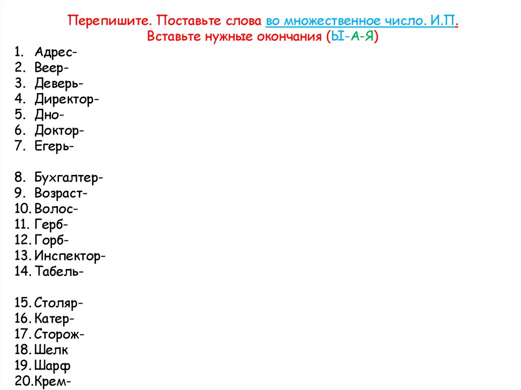 Перепишите. Поставьте слова во множественное число. И.П.