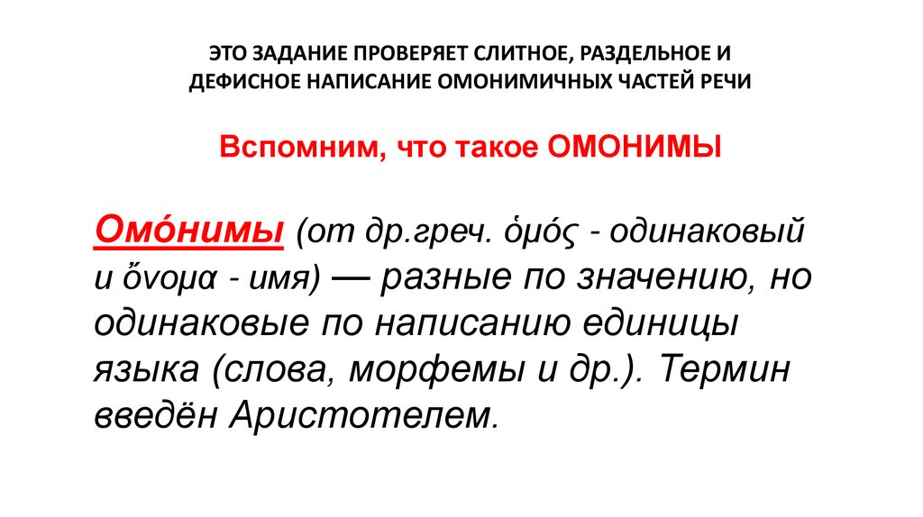 ЭТО ЗАДАНИЕ ПРОВЕРЯЕТ СЛИТНОЕ, РАЗДЕЛЬНОЕ ИДЕФИСНОЕ НАПИСАНИЕ ОМОНИМИЧНЫХ ЧАСТЕЙ РЕЧИ