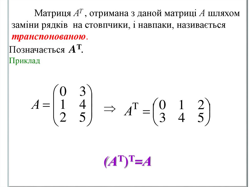 Властивості визначників n-го порядку:1. Визначник матриці А дорівнює визначнику транспонованою