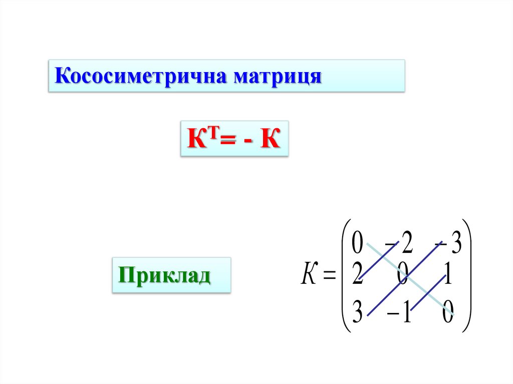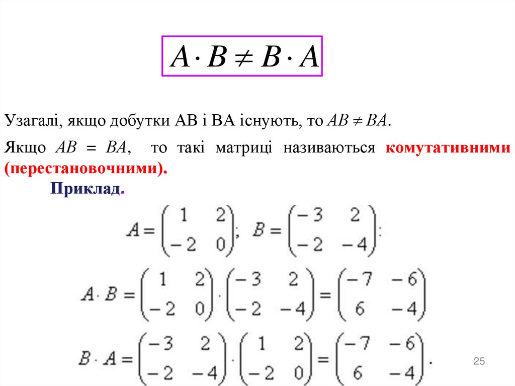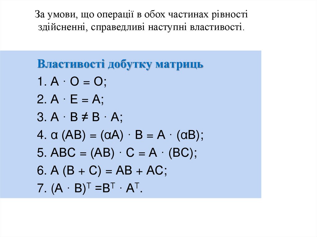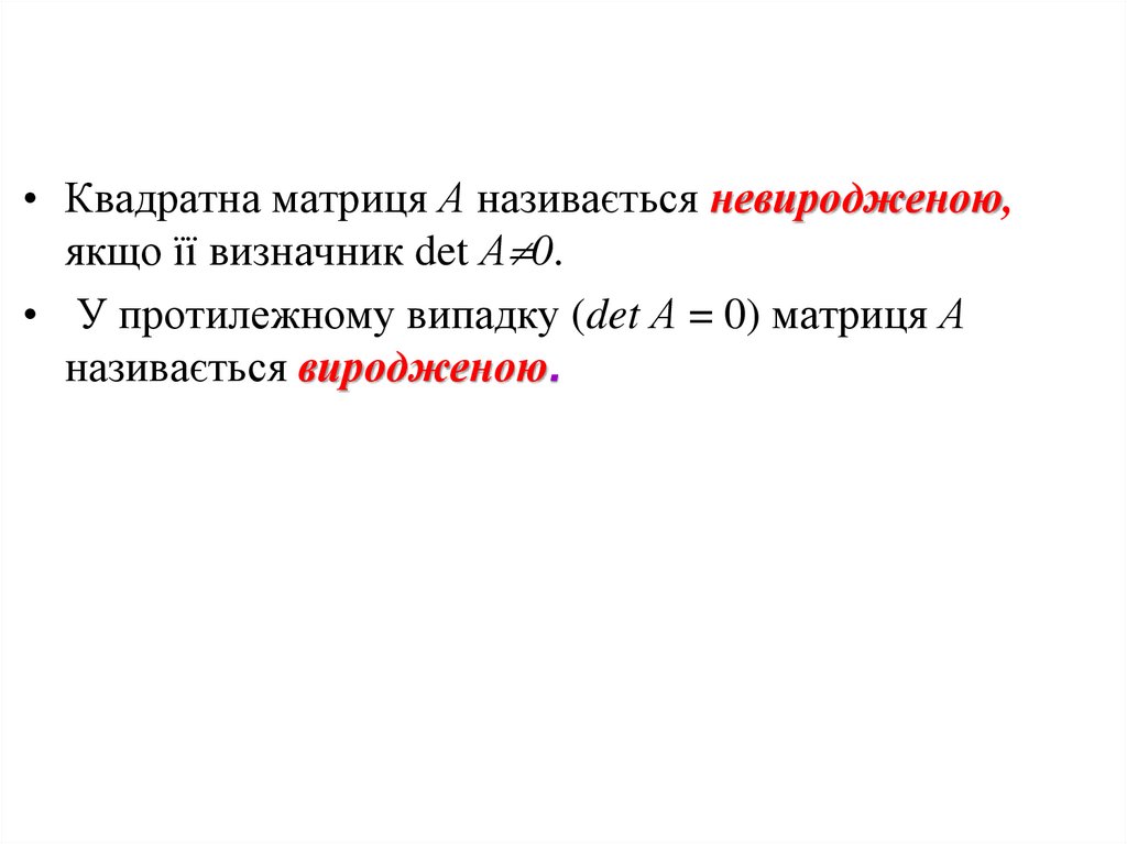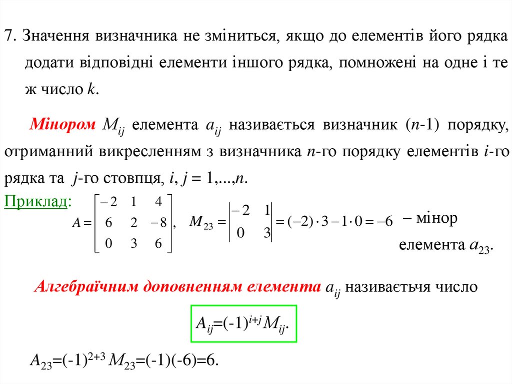 • Сума добутків елементів будь-якого ряду кв. матриці наалгебраїчні доповнення відповідних елементів іншого її