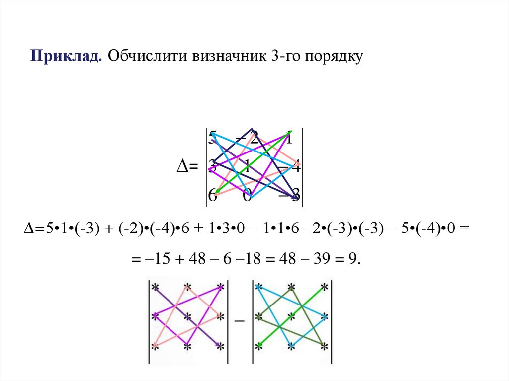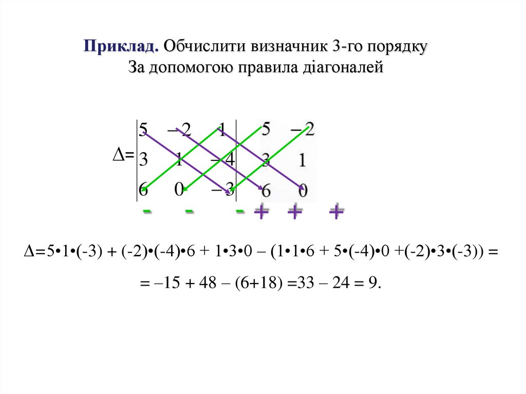 Приклад. Обчислити визначник 3-го порядкуЗа допомогою правила діагоналей