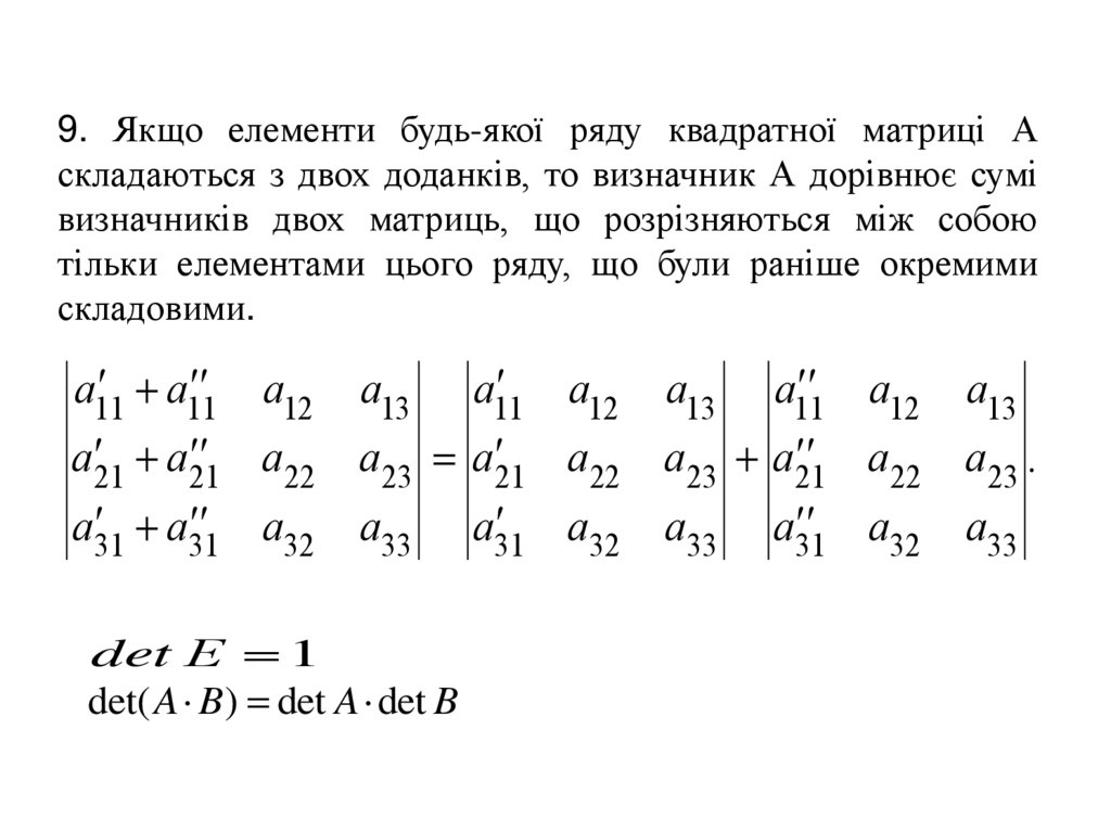 9. Якщо елементи будь-якої ряду квадратної матриці Аскладаються з двох доданків, то визначник А дорівнює сумі
