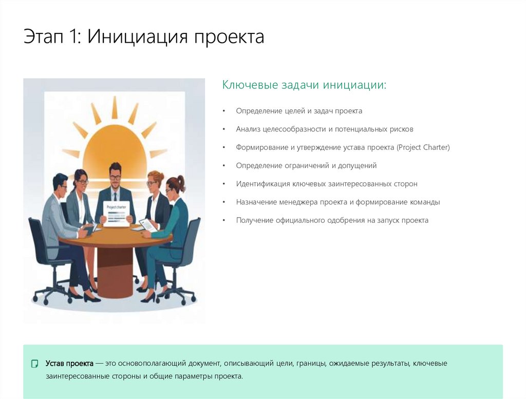 Результат: Утверждённый устав проекта, предварительный бюджет, назначение руководителя.