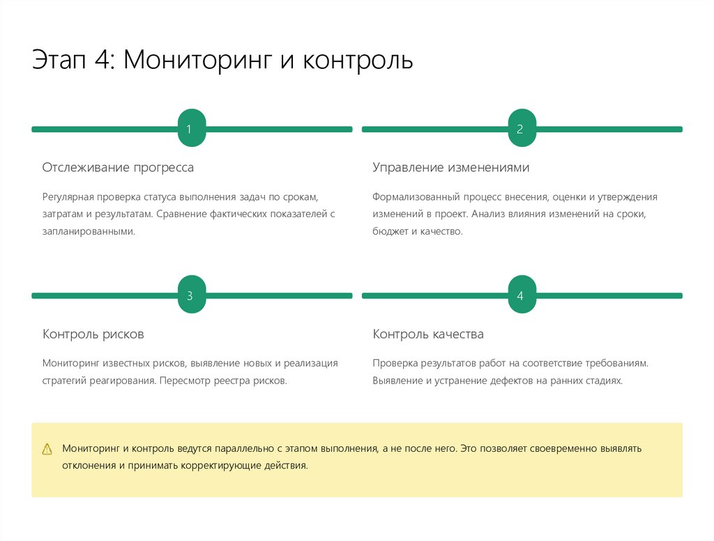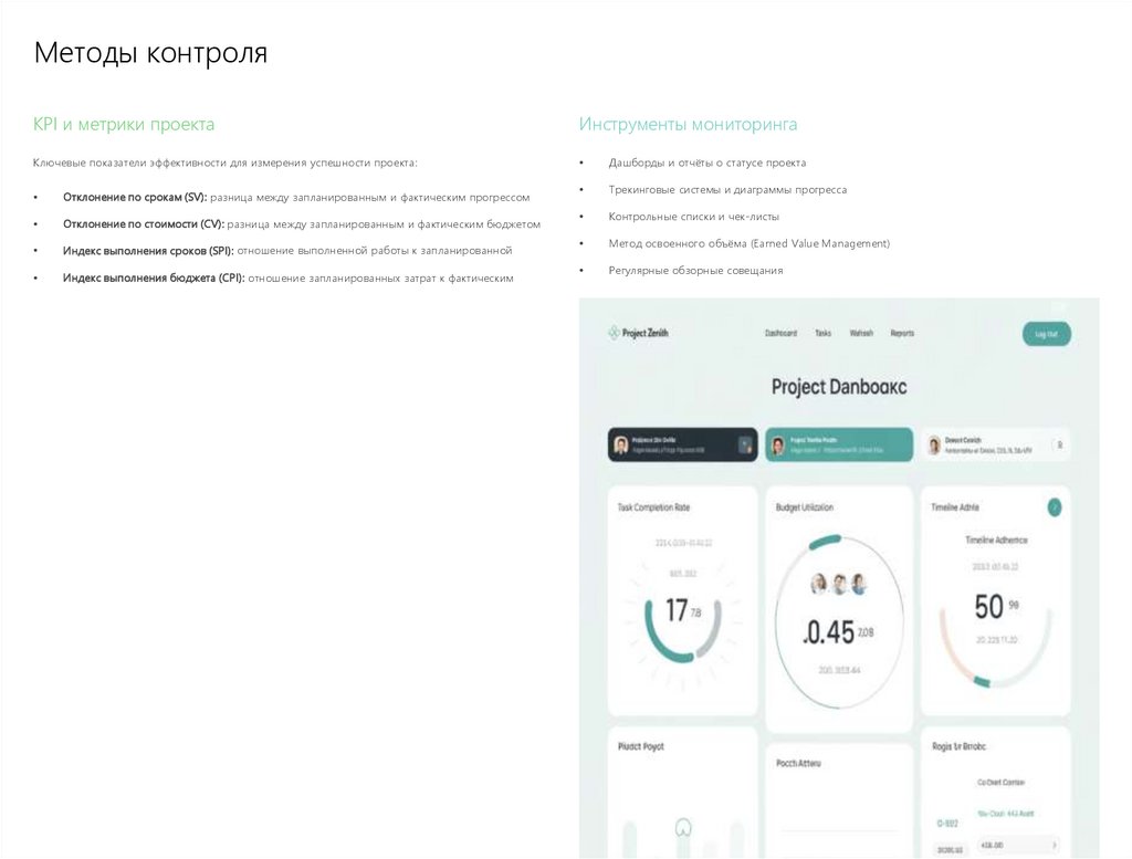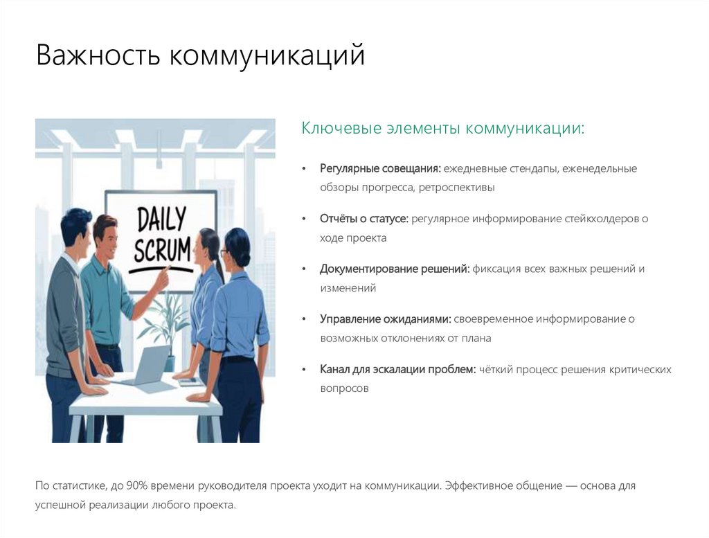 Действия: Ежедневные отчёты о прогрессе, контроль отклонений, корректировки плана.