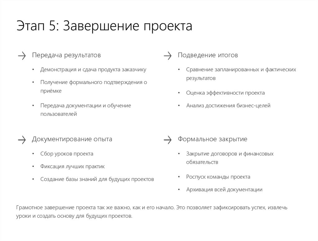 Результат: Принятый заказчиком объект, извлечённые уроки, формальное закрытие.