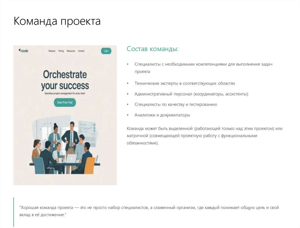 успешное завершение проекта. Координирует