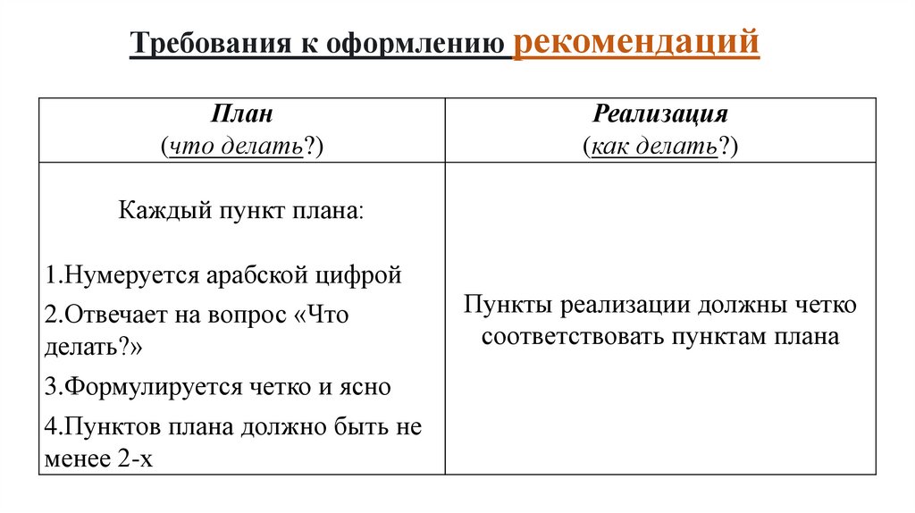 соответствовать пунктам плана