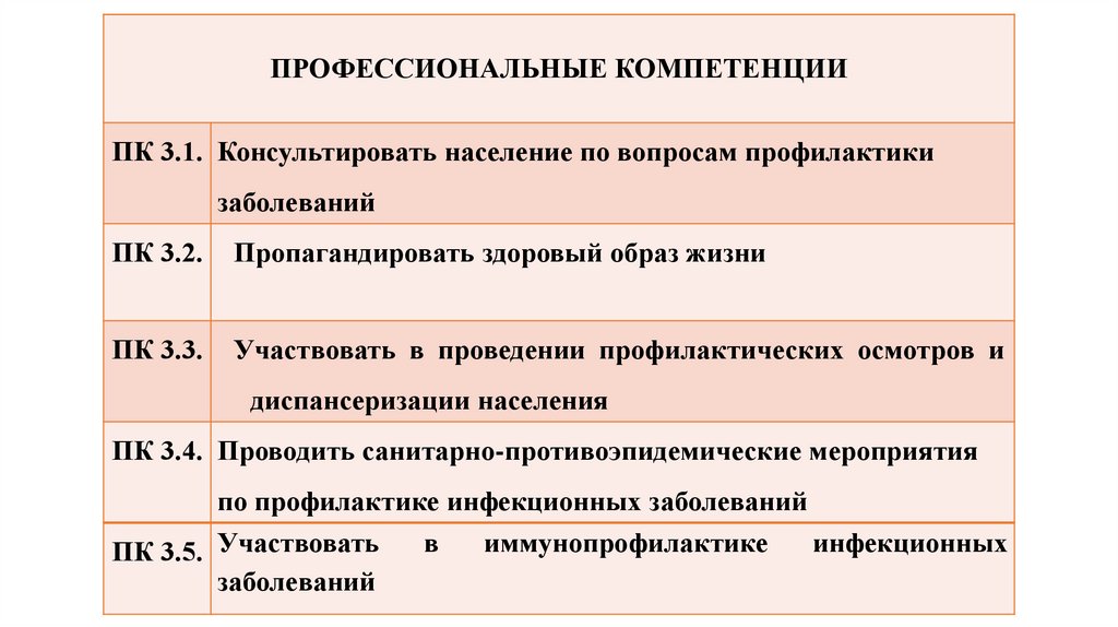 ПРОФЕССИОНАЛЬНЫЕ КОМПЕТЕНЦИИПК 3.1. Консультировать население по вопросам профилактики