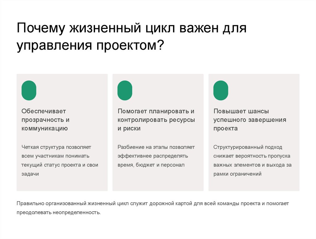 Правильно организованный жизненный цикл служит дорожной картой для всей команды проекта и помогает