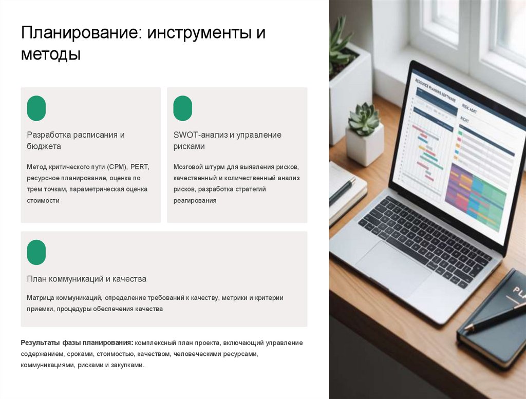 Результаты фазы планирования: комплексный план проекта, включающий управление