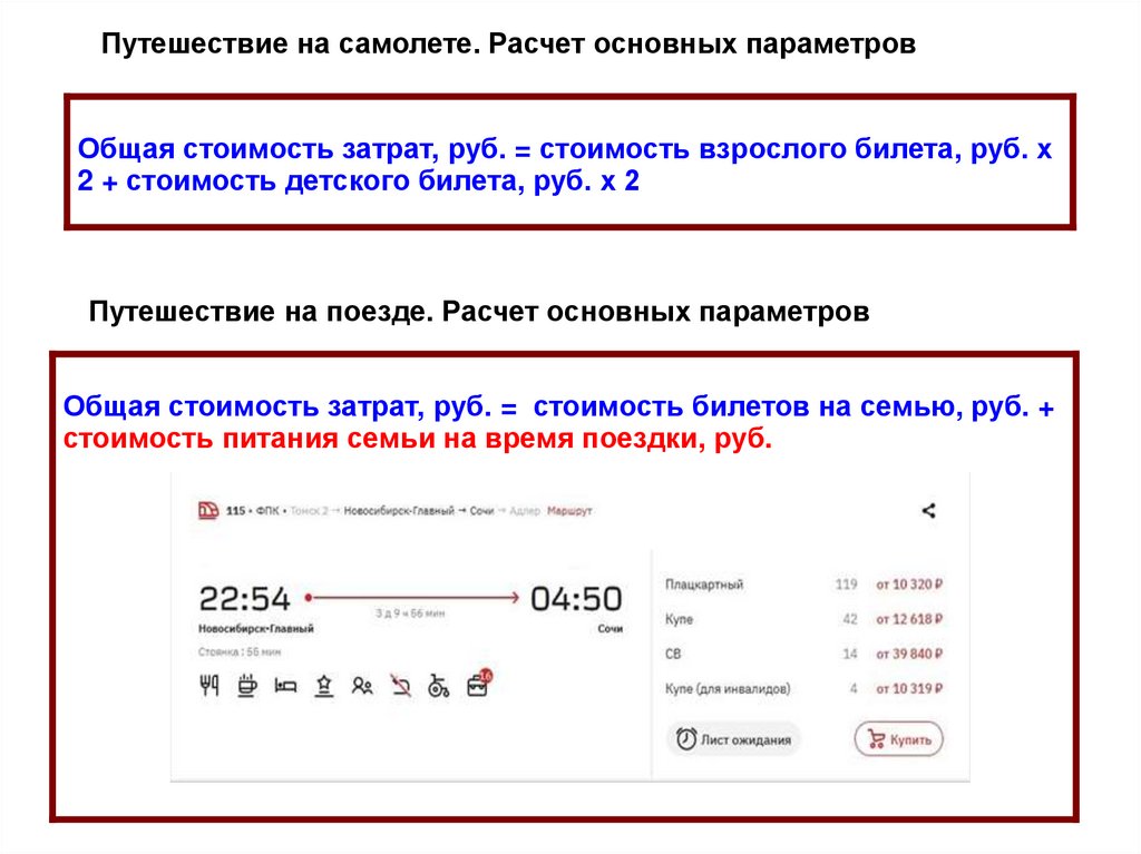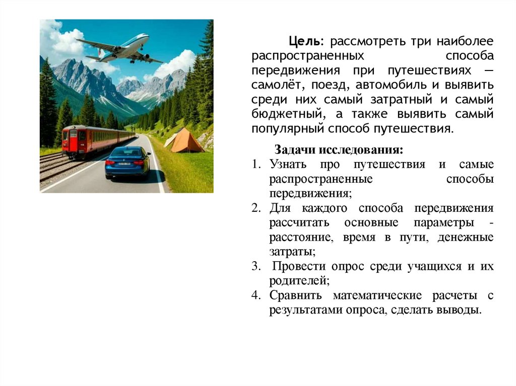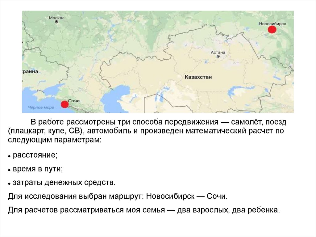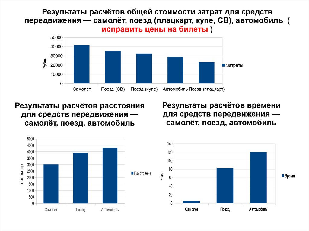 В работе рассмотрены три способа передвижения — самолёт, поезд(плацкарт, купе, СВ), автомобиль и произведен математический расчет по