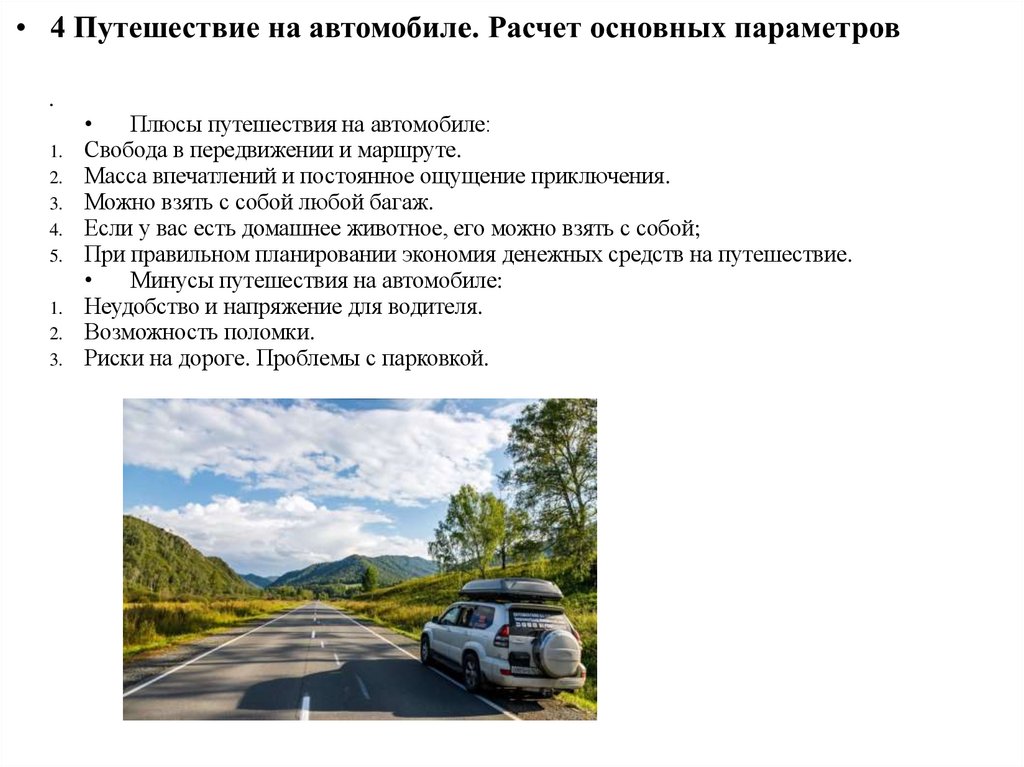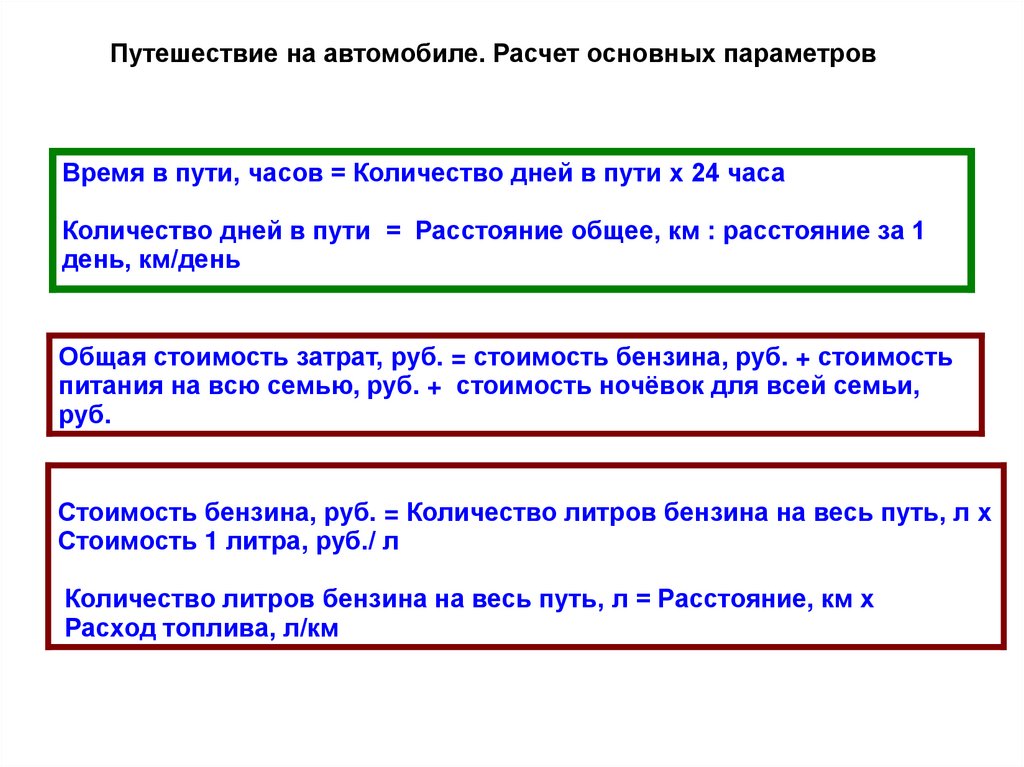 Путешествие на автомобиле. Расчет основных параметровВремя в пути, часов = Количество дней в пути х 24 часа