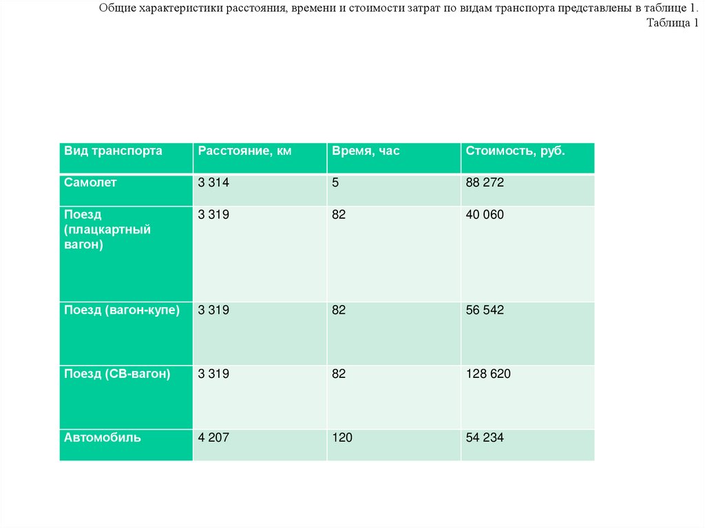 Общие характеристики расстояния, времени и стоимости затрат по видам транспорта представлены в таблице 1.Таблица 1