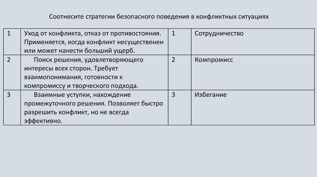Соотнесите стратегии безопасного поведения в конфликтных ситуациях1