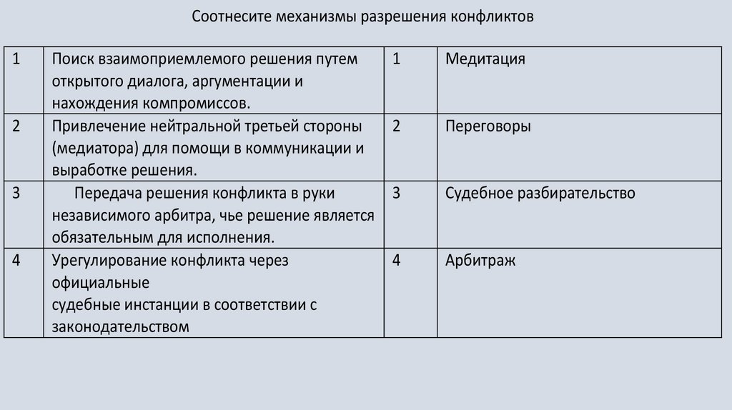 Соотнесите механизмы разрешения конфликтов1