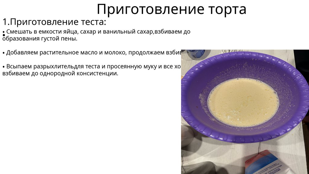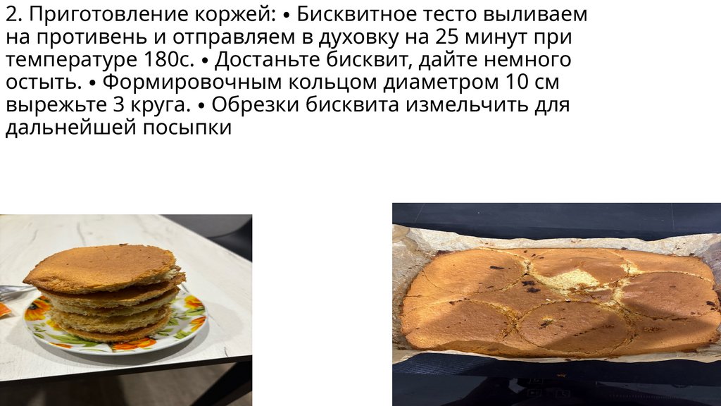 2. Приготовление коржей: ⦁ Бисквитное тесто выливаемна противень и отправляем в духовку на 25 минут при
