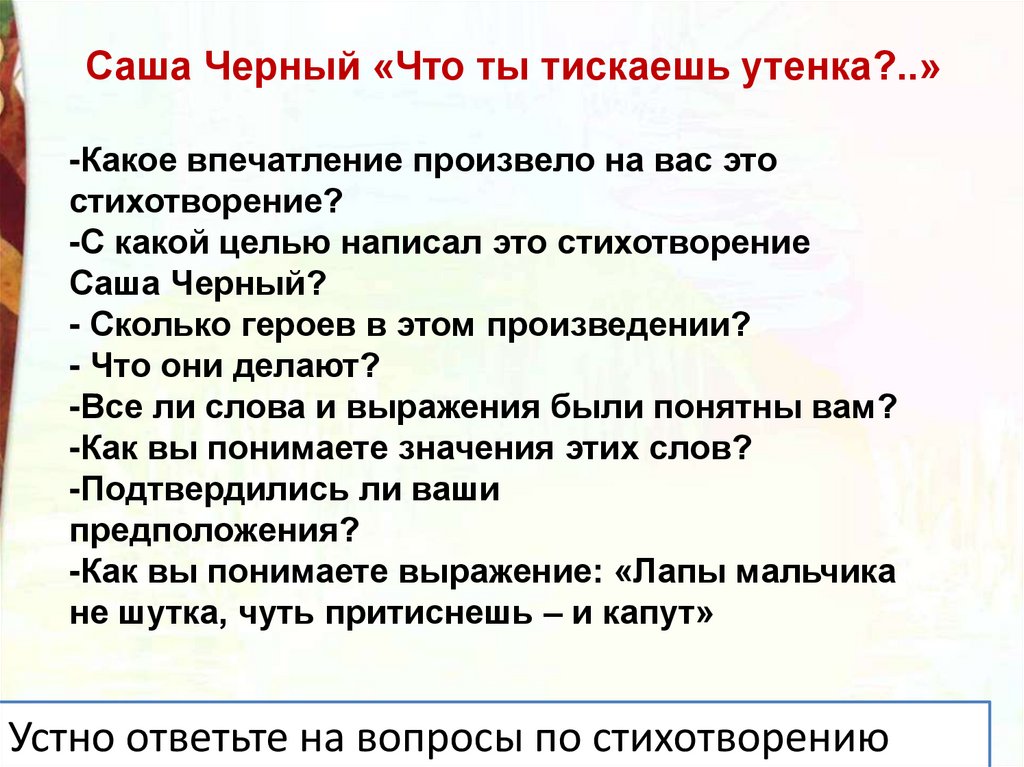 Саша Черный «Что ты тискаешь утенка?..»-Какое впечатление произвело на вас это