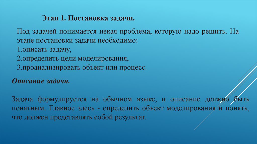 Этап 1. Постановка задачи.Под задачей понимается некая проблема, которую надо решить. На