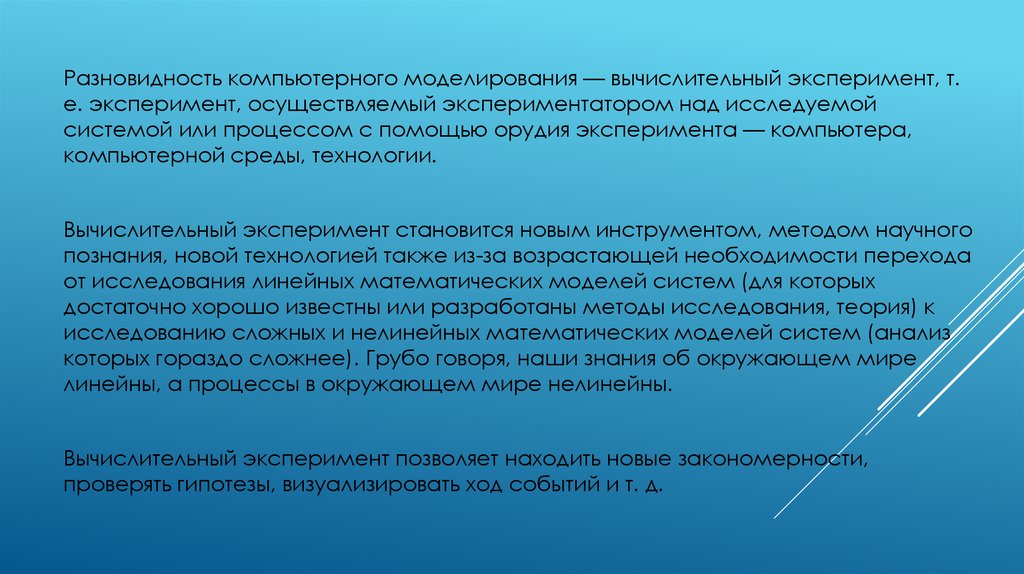 Разновидность компьютерного моделирования — вычислительный эксперимент, т.е. эксперимент, осуществляемый экспериментатором над исследуемой