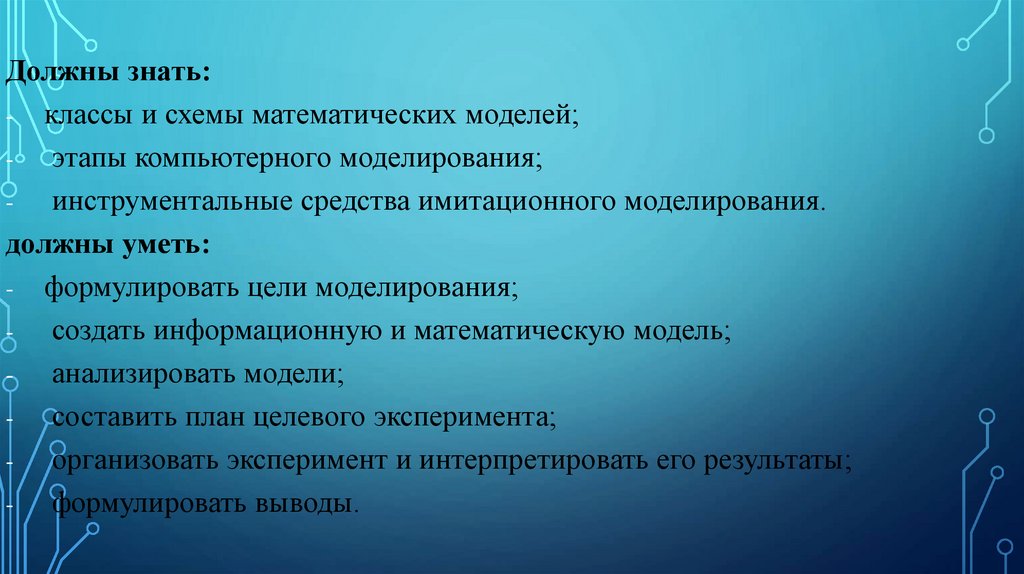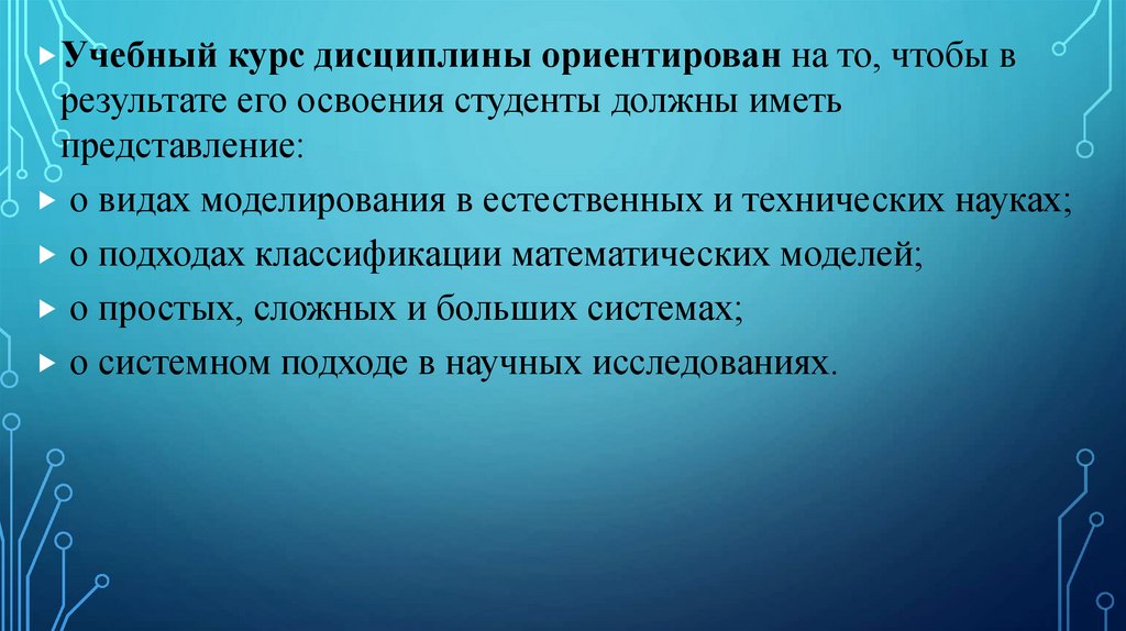 • Целью данного курса является изучение основтеории моделирования, приобретение навыков