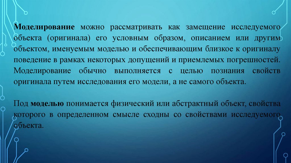 Моделирование можно рассматривать как замещение исследуемогообъекта (оригинала) его условным образом, описанием или другим