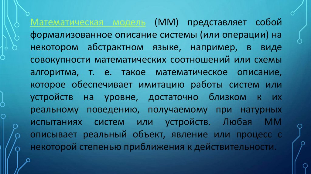 Математическая модель (ММ) представляет собойформализованное описание системы (или операции) на