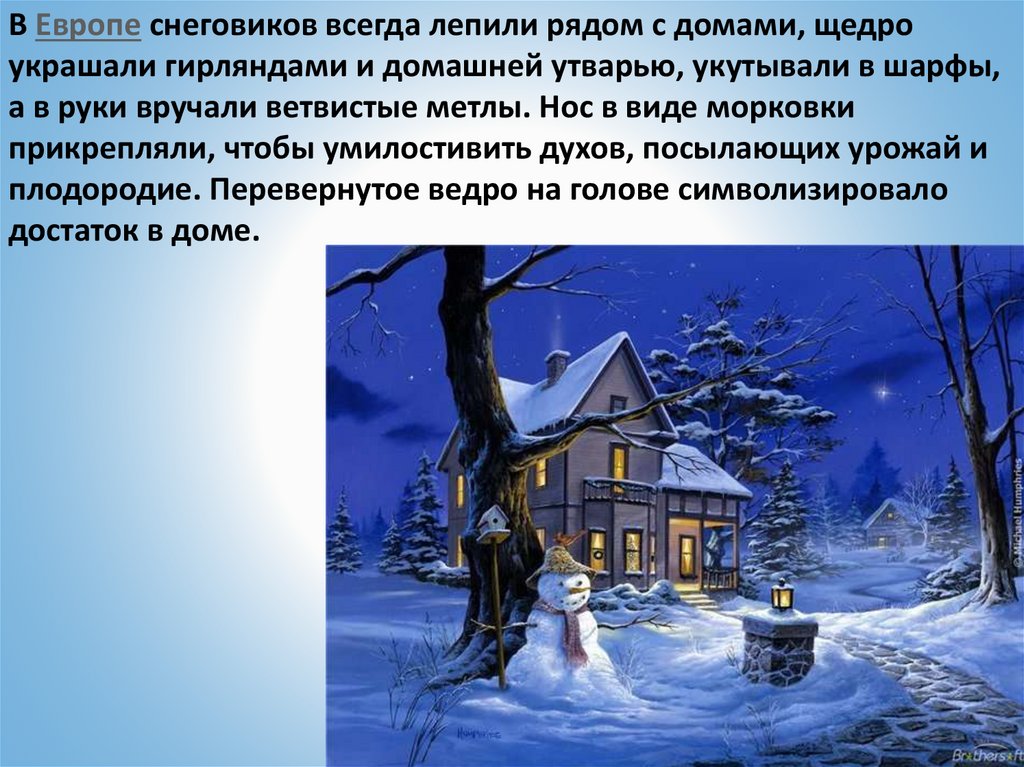 В Европе снеговиков всегда лепили рядом с домами, щедроукрашали гирляндами и домашней утварью, укутывали в шарфы,