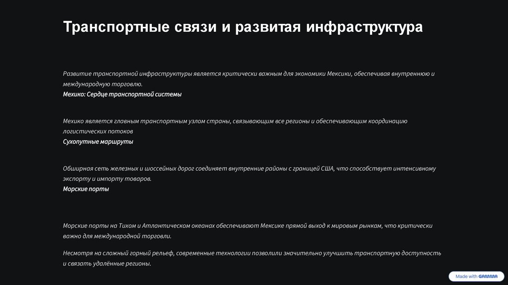 Транспортные связи и развитая инфраструктураРазвитие транспортной инфраструктуры является критически важным для экономики Мексики, обеспечивая внутреннюю и