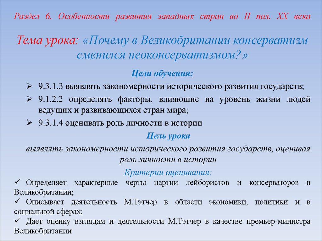 Раздел 6. Особенности развития западных стран во ІІ пол. ХХ векаТема урока: «Почему в Великобритании консерватизм