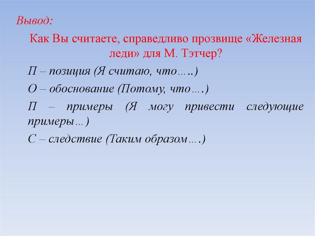 П – позиция (Я считаю, что…..)