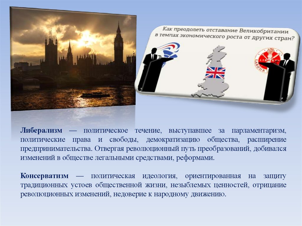 Либерализм — политическое течение, выступавшее за парламентаризм,политические права и свободы, демократизацию общества, расширение