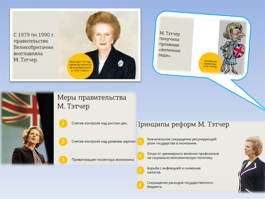 Описывает деятельность М.Тэтчер в области экономики, политики и в