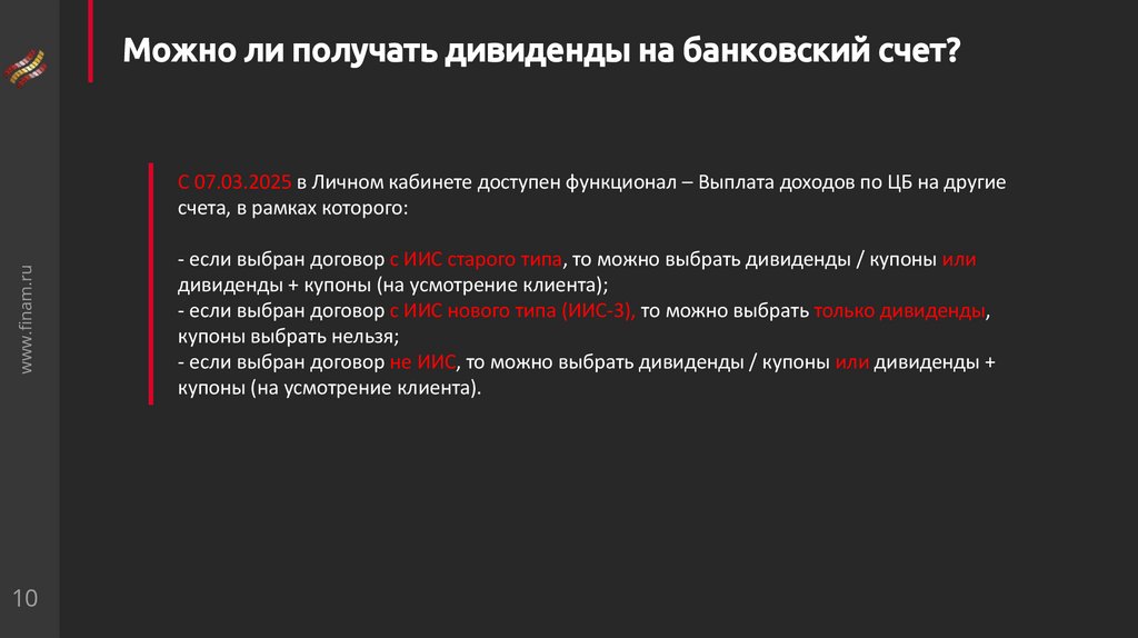 Можно ли получать дивиденды на банковский счет?www.finam.ru