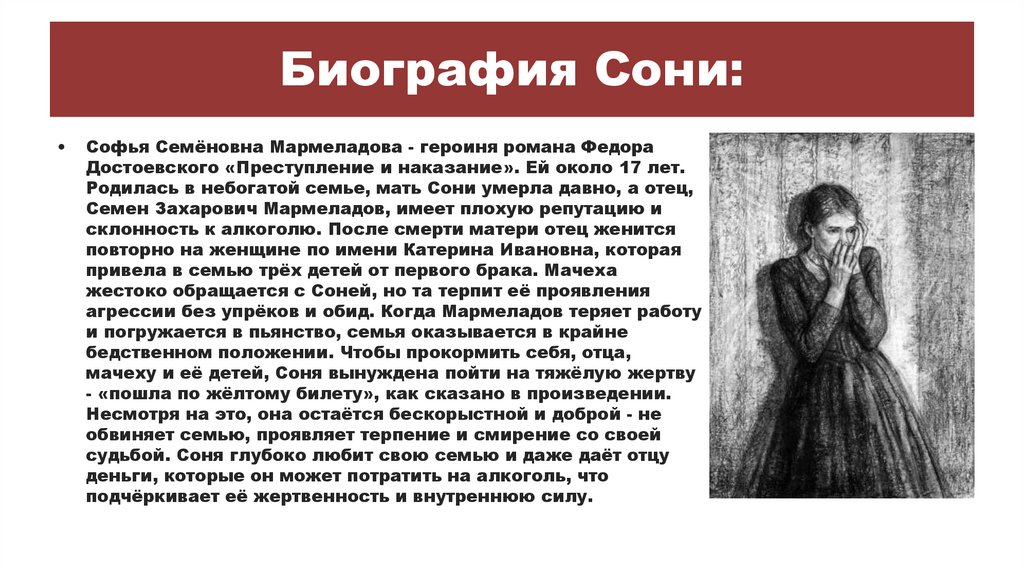 Биография Сони:Софья Семёновна Мармеладова - героиня романа Федора