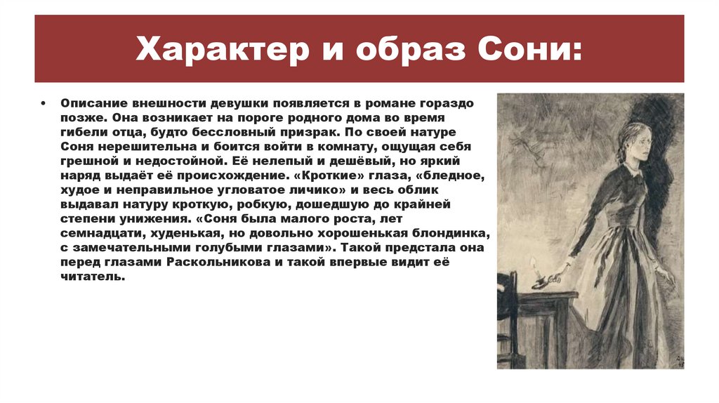 Характер и образ Сони:Описание внешности девушки появляется в романе гораздо
