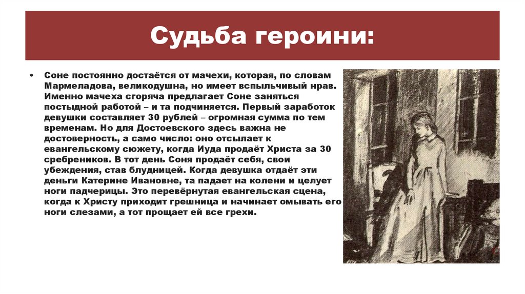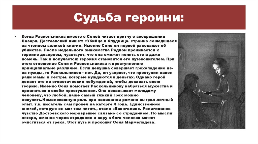 Судьба героини:Когда Раскольников вместе с Соней читает притчу о воскрешении