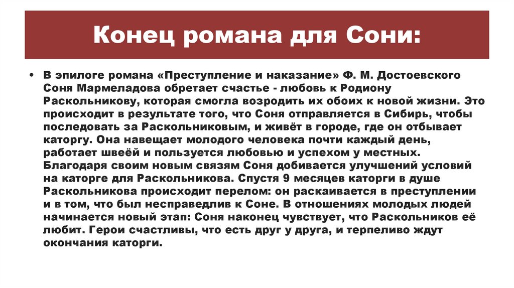 Конец романа для Сони:• В эпилоге романа «Преступление и наказание» Ф. М. Достоевского
