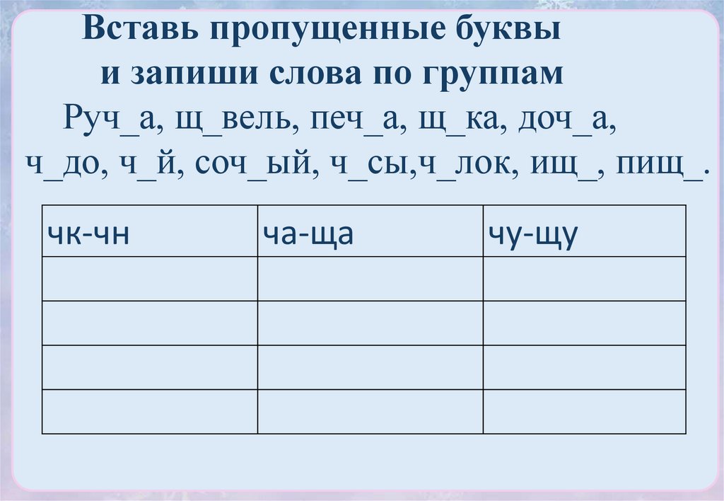 Руч_а, щ_вель, печ_а, щ_ка, доч_а,