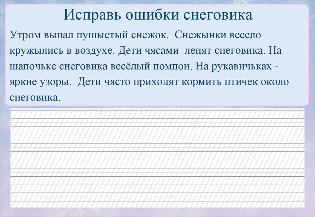 Исправь ошибки снеговикаУтром выпал пушыстый снежок. Снежынки весело