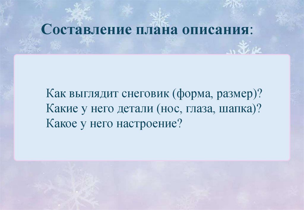Составление плана описания:Как выглядит снеговик (форма, размер)?