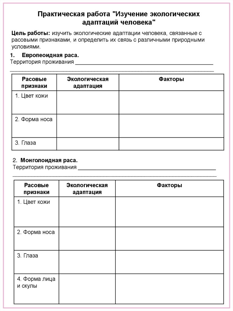 Цель работы: изучить экологические адаптации человека, связанные с