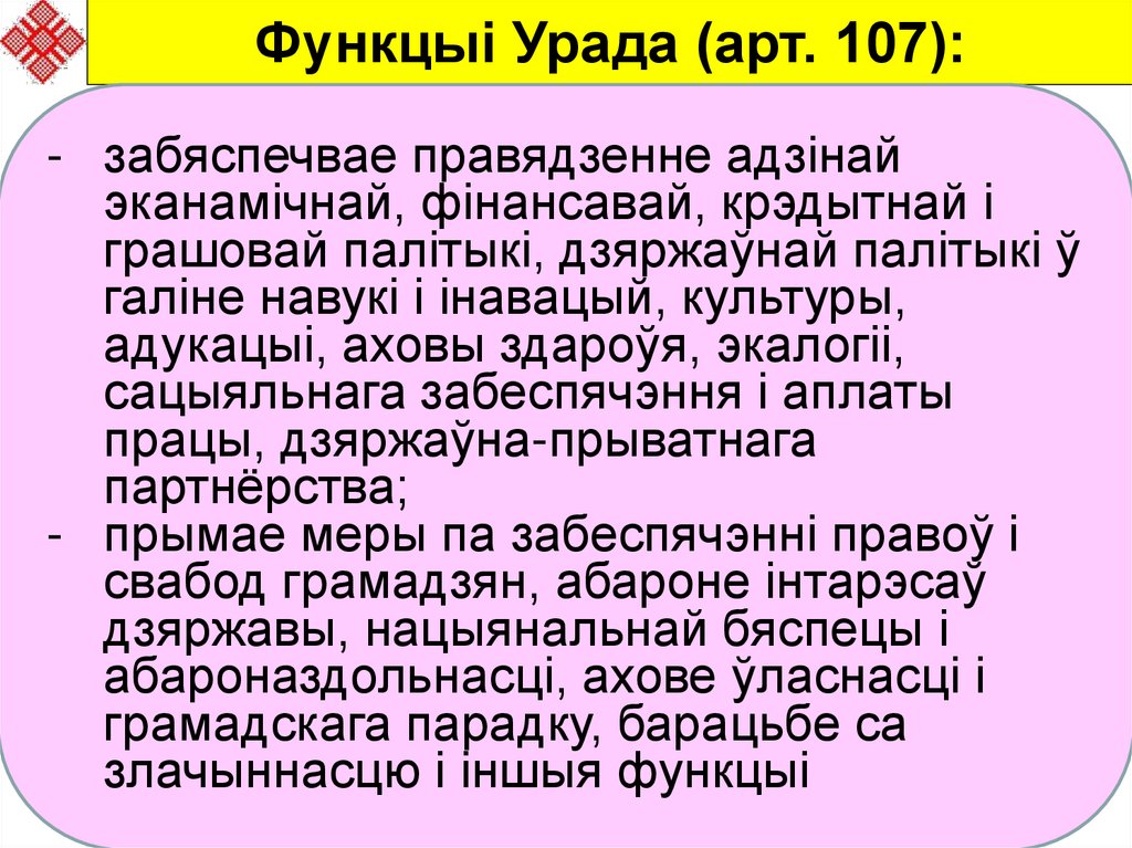 Функцыі Урада (арт. 107):- забяспечвае правядзенне адзінай