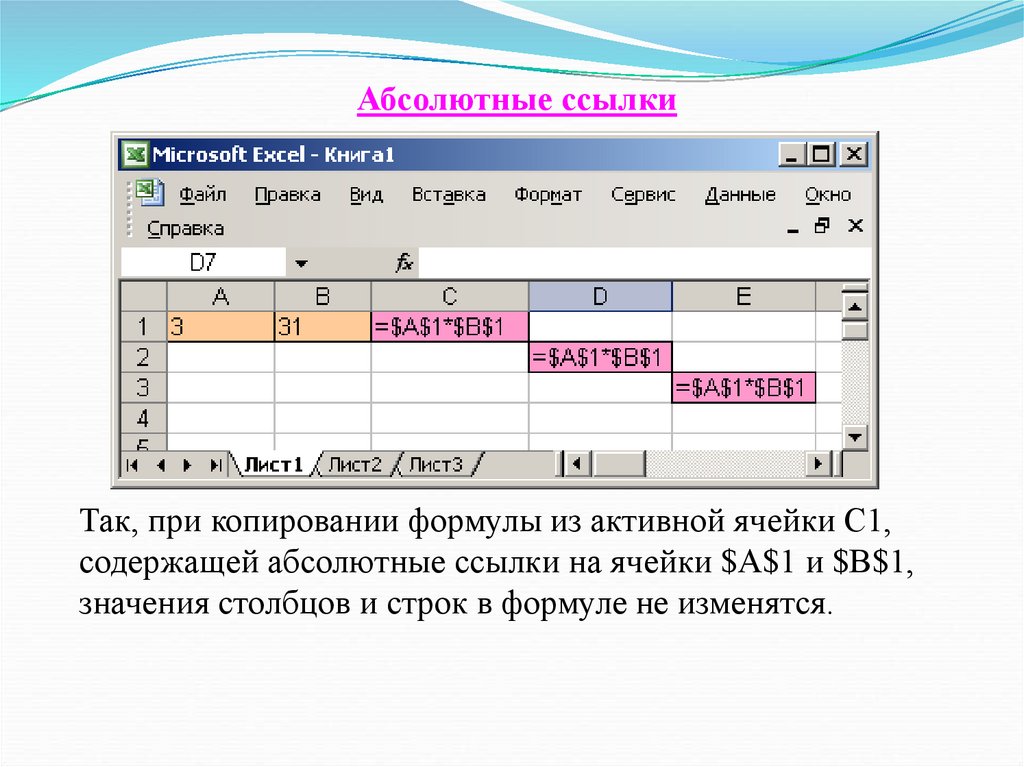 Абсолютные ссылкиТак, при копировании формулы из активной ячейки С1,