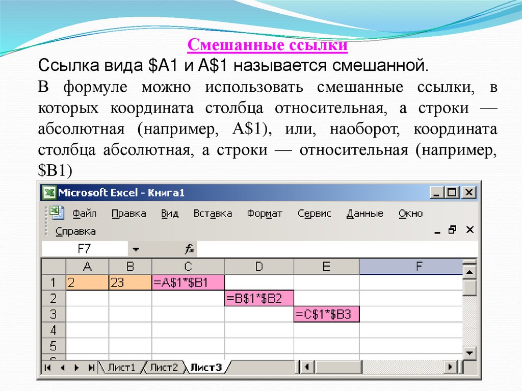 Смешанные ссылкиСсылка вида $A1 и A$1 называется смешанной.