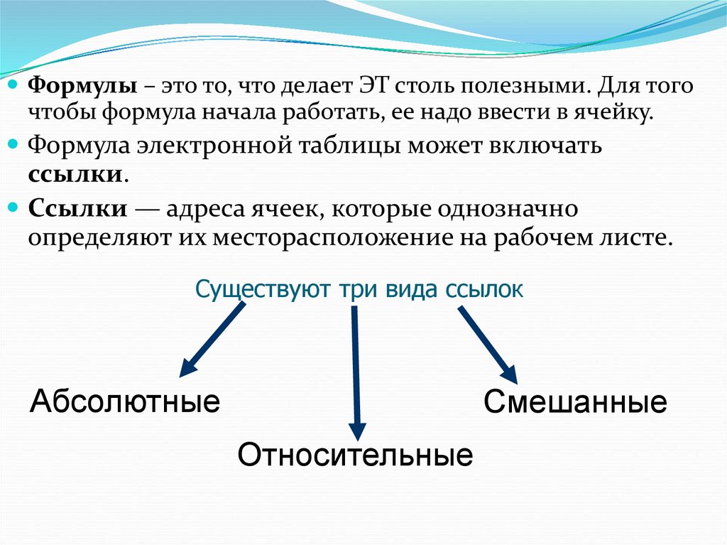 Формулы – это то, что делает ЭТ столь полезными. Для тогочтобы формула начала работать, ее надо ввести в ячейку.