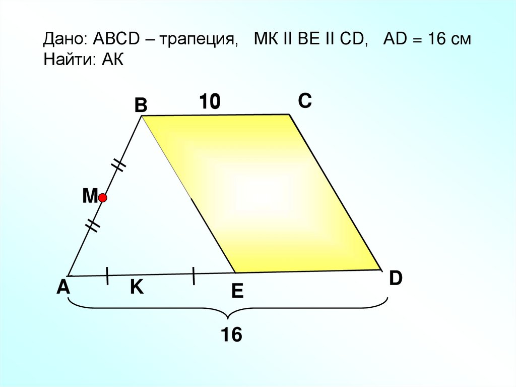 Дано: АВСD – трапеция, МК II ВE II СD, АD = 16 cмНайти: АК