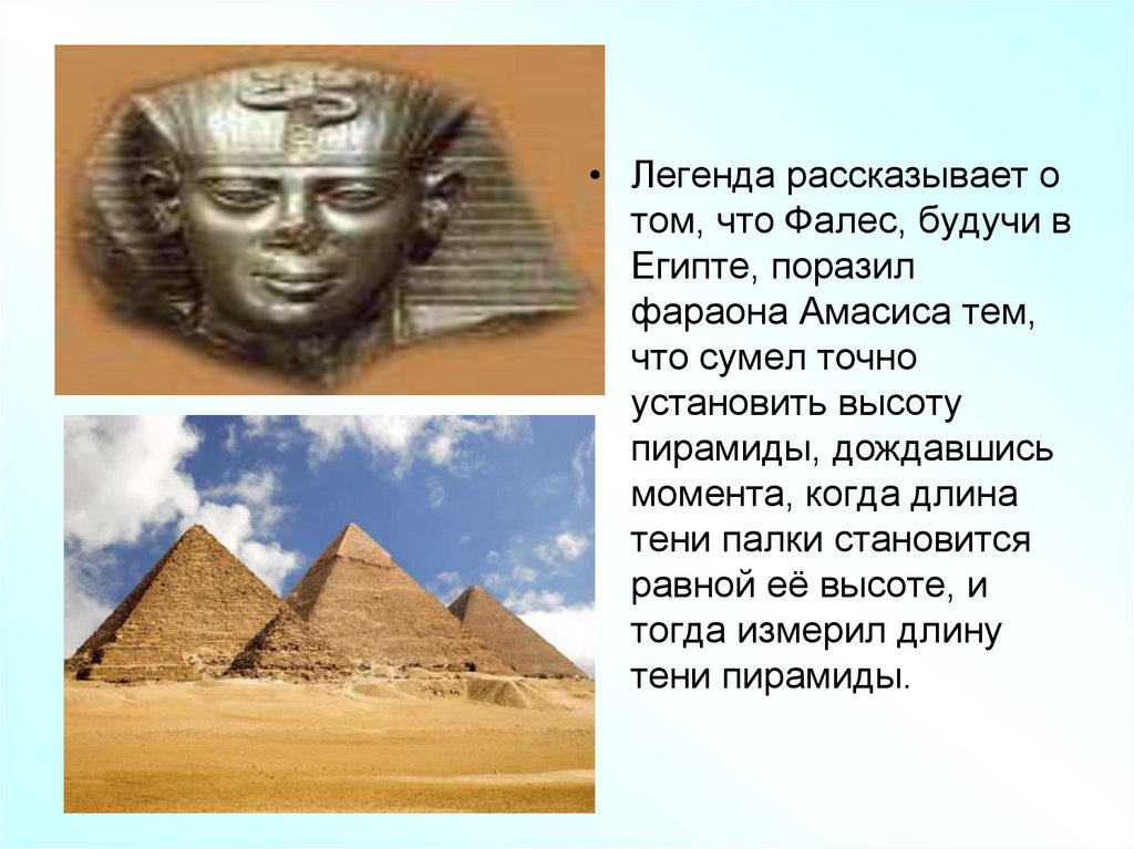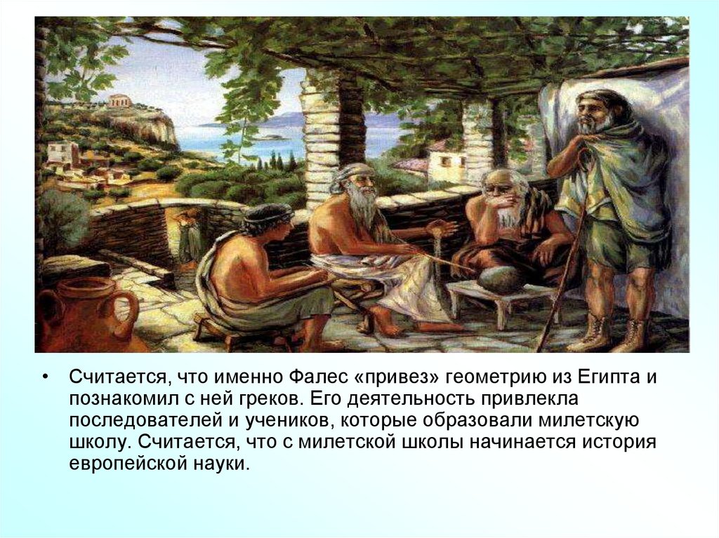 • Считается, что именно Фалес «привез» геометрию из Египта ипознакомил с ней греков. Его деятельность привлекла