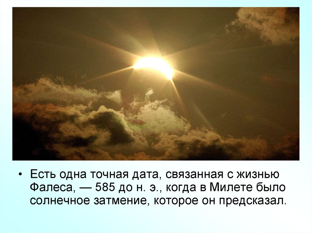 • Есть одна точная дата, связанная с жизньюФалеса, — 585 до н. э., когда в Милете было