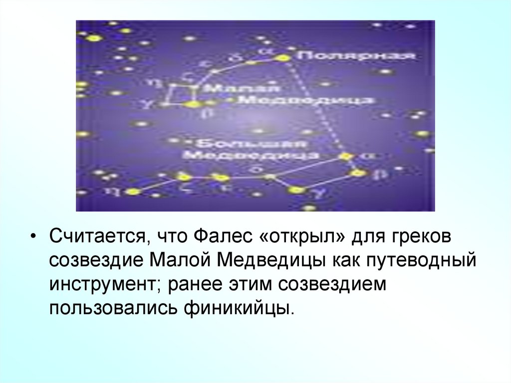 • Считается, что Фалес «открыл» для грековсозвездие Малой Медведицы как путеводный