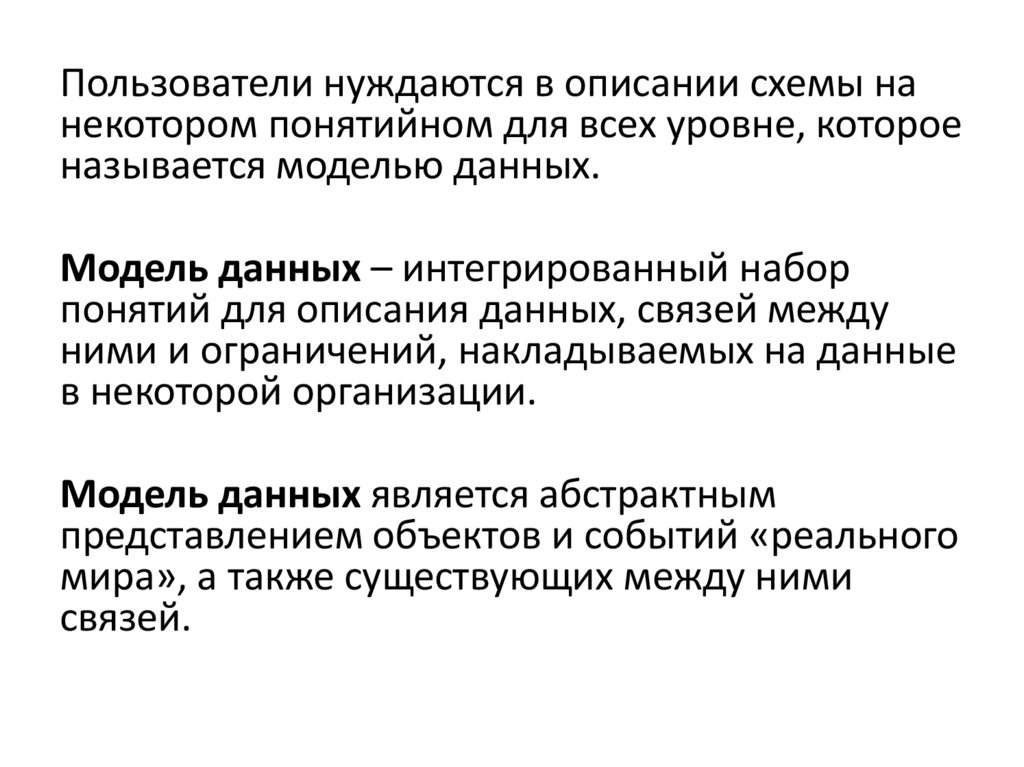 Пользователи нуждаются в описании схемы нанекотором понятийном для всех уровне, которое